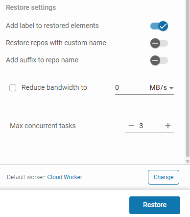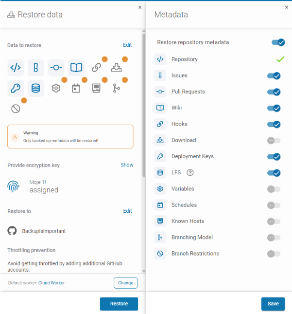 Now, onto restore settings – if a repository with the same name already exists in GitHub, you can add suffixes (repositories with identical names will be skipped; we never overwrite existing ones).